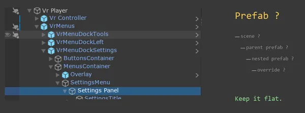 Let's take a concrete case. On one of my projects, a colleague asks me why the Settings menu isn't a separate prefab. As it stands, its configuration is attached directly to the parent prefab VRMenus. To modify Settings, you have to go through VRMenus.
